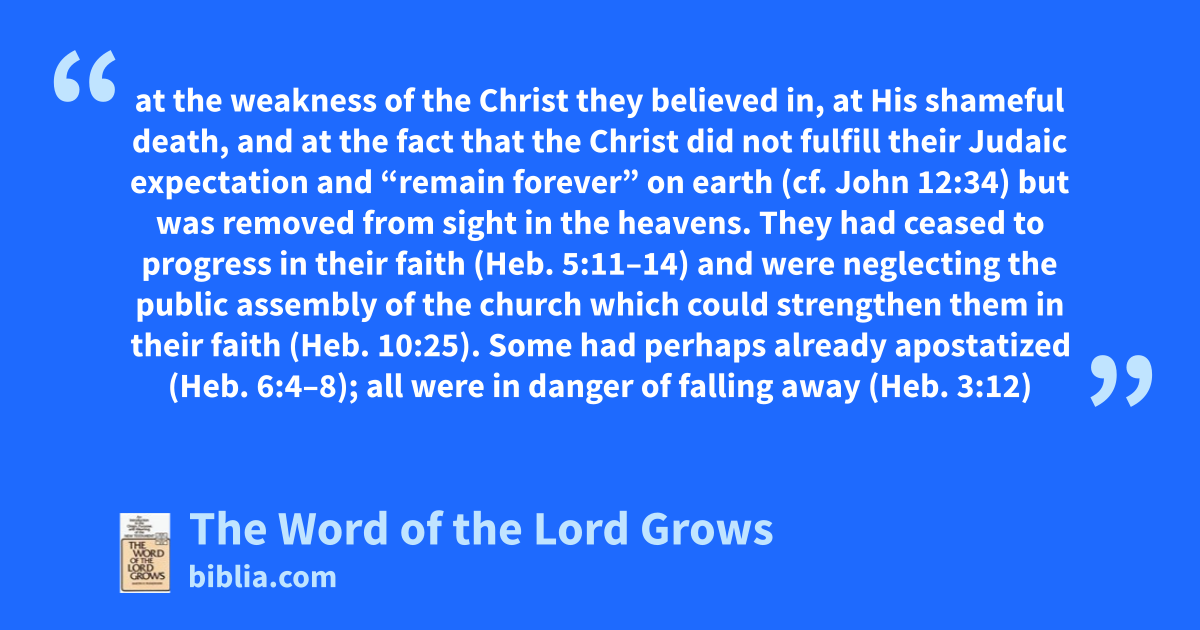 at the weakness of the Christ they believed in, at His shameful death, and at the fact that the Christ did not fulfill their Judaic expectation and “remain forever” on earth (cf. John 12:34) but was removed from sight in the heavens. They had ceased to progress in their faith (Heb. 5:11–14) and were neglecting the public assembly of the church which could strengthen them in their faith (Heb. 10:25). Some had perhaps already apostatized (Heb. 6:4–8); all were in danger of falling away (Heb. 3:12)