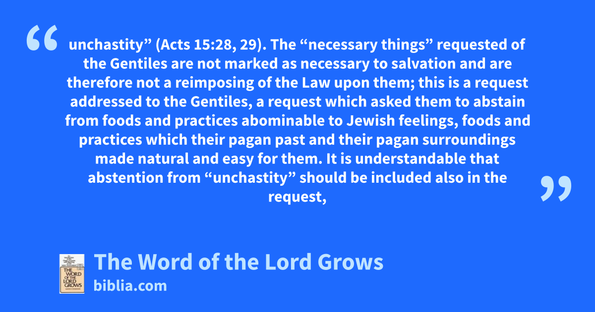 unchastity” (Acts 15:28, 29). The “necessary things” requested of the Gentiles are not marked as necessary to salvation and are therefore not a reimposing of the Law upon them; this is a request addressed to the Gentiles, a request which asked them to abstain from foods and practices abominable to Jewish feelings, foods and practices which their pagan past and their pagan surroundings made natural and easy for them. It is understandable that abstention from “unchastity” should be included also in the request,