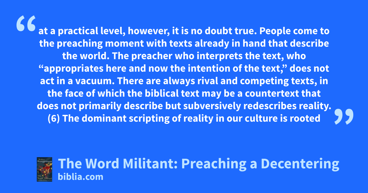 at a practical level, however, it is no doubt true. People come to the preaching moment with texts already in hand that describe the world. The preacher who interprets the text, who “appropriates here and now the intention of the text,” does not act in a vacuum. There are always rival and competing texts, in the face of which the biblical text may be a countertext that does not primarily describe but subversively redescribes reality. (6) The dominant scripting of reality in our culture is rooted
