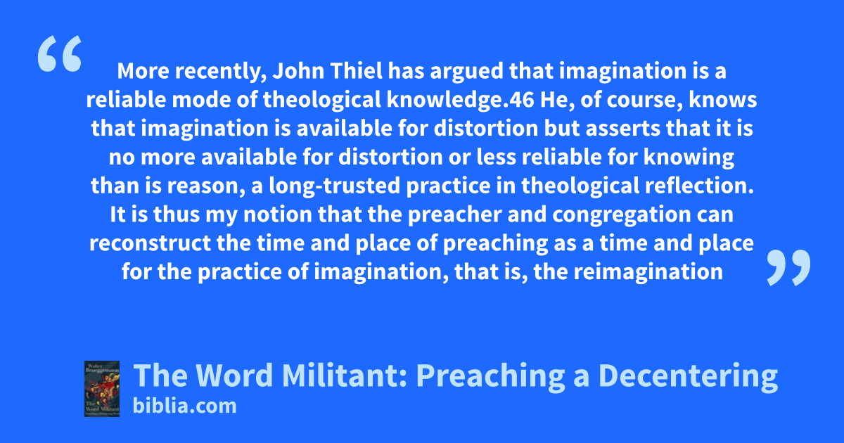 More recently, John Thiel has argued that imagination is a reliable mode of theological knowledge.46 He, of course, knows that imagination is available for distortion but asserts that it is no more available for distortion or less reliable for knowing than is reason, a long-trusted practice in theological reflection. It is thus my notion that the preacher and congregation can reconstruct the time and place of preaching as a time and place for the practice of imagination, that is, the reimagination