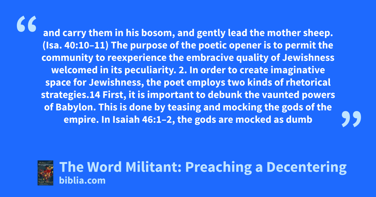and carry them in his bosom, and gently lead the mother sheep. (Isa. 40:10–11) The purpose of the poetic opener is to permit the community to reexperience the embracive quality of Jewishness welcomed in its peculiarity. 2. In order to create imaginative space for Jewishness, the poet employs two kinds of rhetorical strategies.14 First, it is important to debunk the vaunted powers of Babylon. This is done by teasing and mocking the gods of the empire. In Isaiah 46:1–2, the gods are mocked as dumb
