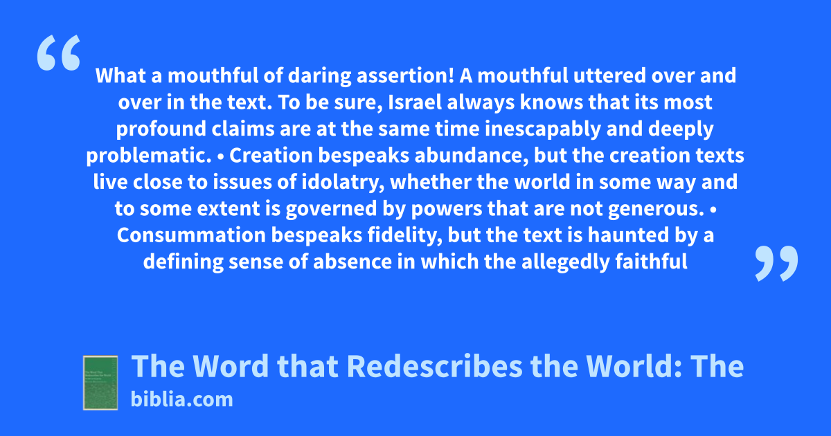 What a mouthful of daring assertion! A mouthful uttered over and over in the text. To be sure, Israel always knows that its most profound claims are at the same time inescapably and deeply problematic. • Creation bespeaks abundance, but the creation texts live close to issues of idolatry, whether the world in some way and to some extent is governed by powers that are not generous. • Consummation bespeaks fidelity, but the text is haunted by a defining sense of absence in which the allegedly faithful