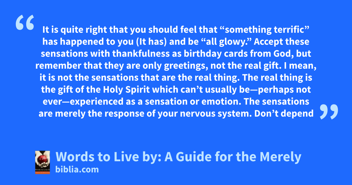 It is quite right that you should feel that “something terrific” has happened to you (It has) and be “all glowy.” Accept these sensations with thankfulness as birthday cards from God, but remember that they are only greetings, not the real gift. I mean, it is not the sensations that are the real thing. The real thing is the gift of the Holy Spirit which can’t usually be—perhaps not ever—experienced as a sensation or emotion. The sensations are merely the response of your nervous system. Don’t depend