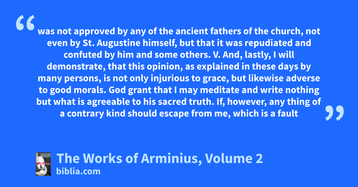 was not approved by any of the ancient fathers of the church, not even by St. Augustine himself, but that it was repudiated and confuted by him and some others. V. And, lastly, I will demonstrate, that this opinion, as explained in these days by many persons, is not only injurious to grace, but likewise adverse to good morals. God grant that I may meditate and write nothing but what is agreeable to his sacred truth. If, however, any thing of a contrary kind should escape from me, which is a fault
