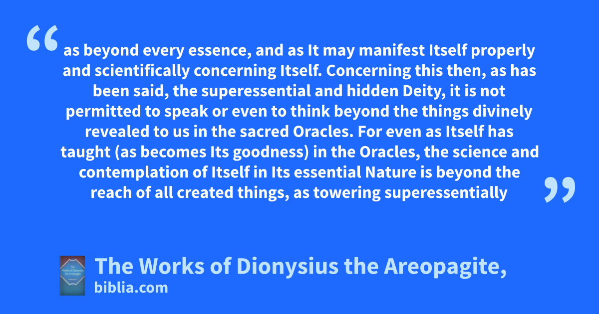 as beyond every essence, and as It may manifest Itself properly and scientifically concerning Itself. Concerning this then, as has been said, the superessential and hidden Deity, it is not permitted to speak or even to think beyond the things divinely revealed to us in the sacred Oracles. For even as Itself has taught (as becomes Its goodness) in the Oracles, the science and contemplation of Itself in Its essential Nature is beyond the reach of all created things, as towering superessentially