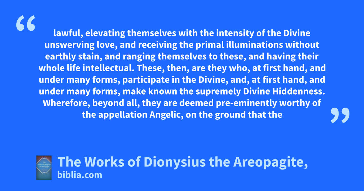 lawful, elevating themselves with the intensity of the Divine unswerving love, and receiving the primal illuminations without earthly stain, and ranging themselves to these, and having their whole life intellectual. These, then, are they who, at first hand, and under many forms, participate in the Divine, and, at first hand, and under many forms, make known the supremely Divine Hiddenness. Wherefore, beyond all, they are deemed pre-eminently worthy of the appellation Angelic, on the ground that the