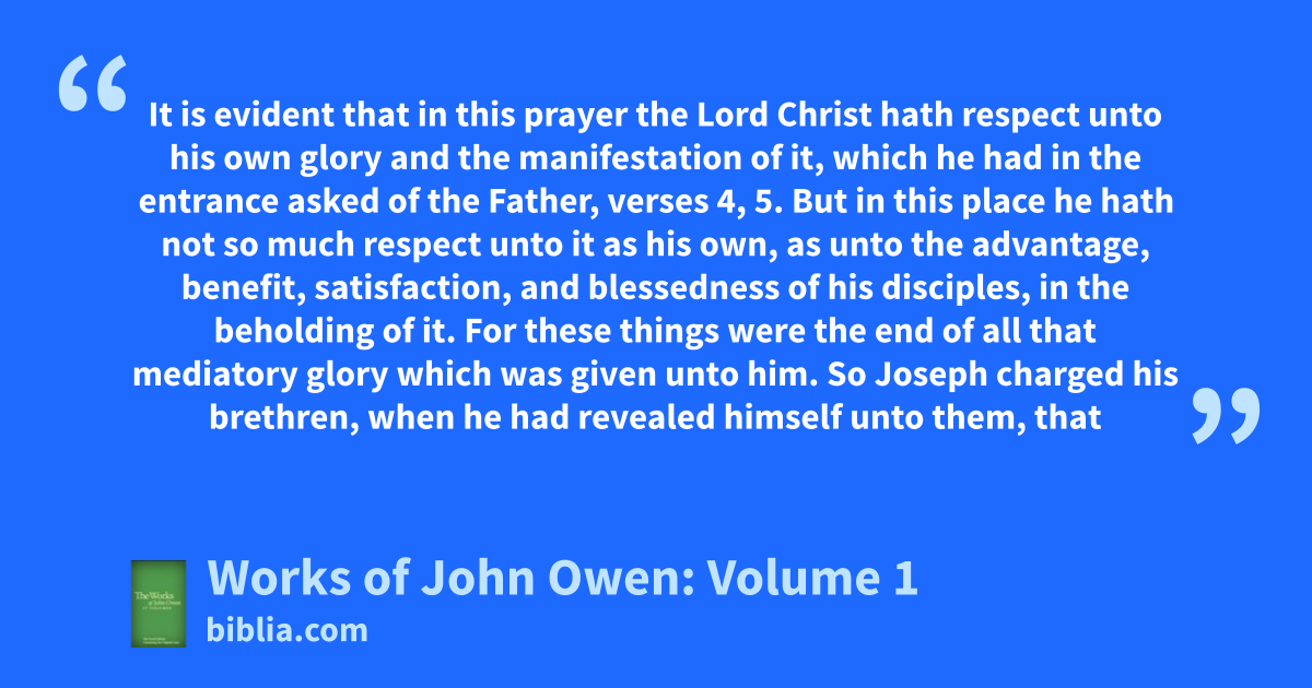 It is evident that in this prayer the Lord Christ hath respect unto his own glory and the manifestation of it, which he had in the entrance asked of the Father, verses 4, 5. But in this place he hath not so much respect unto it as his own, as unto the advantage, benefit, satisfaction, and blessedness of his disciples, in the beholding of it. For these things were the end of all that mediatory glory which was given unto him. So Joseph charged his brethren, when he had revealed himself unto them, that