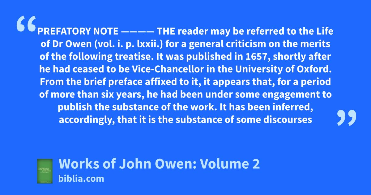 PREFATORY NOTE ———— THE reader may be referred to the Life of Dr Owen (vol. i. p. lxxii.) for a general criticism on the merits of the following treatise. It was published in 1657, shortly after he had ceased to be Vice-Chancellor in the University of Oxford. From the brief preface affixed to it, it appears that, for a period of more than six years, he had been under some engagement to publish the substance of the work. It has been inferred, accordingly, that it is the substance of some discourses