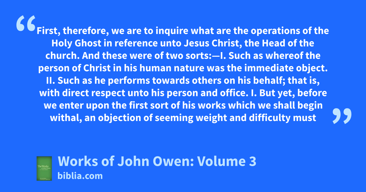 First, therefore, we are to inquire what are the operations of the Holy Ghost in reference unto Jesus Christ, the Head of the church. And these were of two sorts:—I. Such as whereof the person of Christ in his human nature was the immediate object. II. Such as he performs towards others on his behalf; that is, with direct respect unto his person and office. I. But yet, before we enter upon the first sort of his works which we shall begin withal, an objection of seeming weight and difficulty must