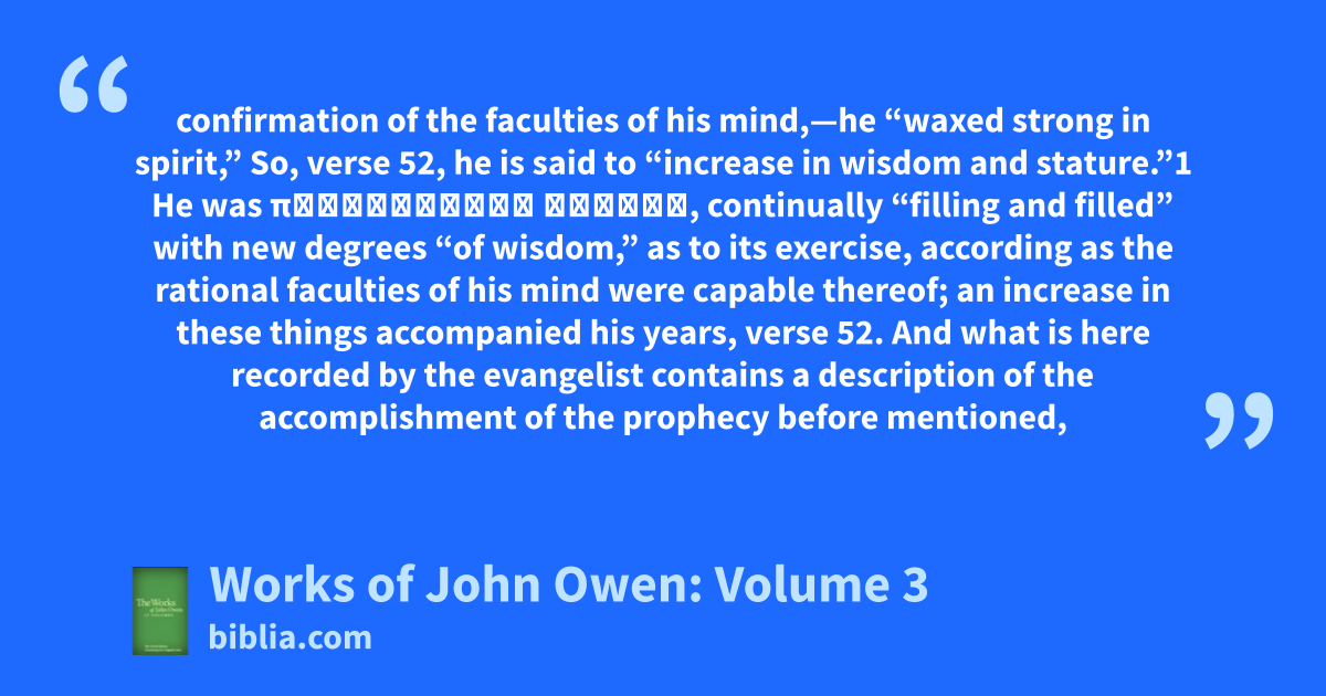 confirmation of the faculties of his mind,—he “waxed strong in spirit,” So, verse 52, he is said to “increase in wisdom and stature.”1 He was πληροὐμενος σοφίας, continually “filling and filled” with new degrees “of wisdom,” as to its exercise, according as the rational faculties of his mind were capable thereof; an increase in these things accompanied his years, verse 52. And what is here recorded by the evangelist contains a description of the accomplishment of the prophecy before mentioned,