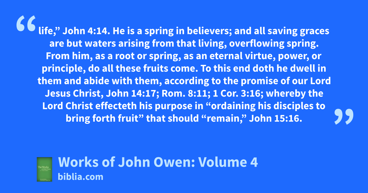 life,” John 4:14. He is a spring in believers; and all saving graces are but waters arising from that living, overflowing spring. From him, as a root or spring, as an eternal virtue, power, or principle, do all these fruits come. To this end doth he dwell in them and abide with them, according to the promise of our Lord Jesus Christ, John 14:17; Rom. 8:11; 1 Cor. 3:16; whereby the Lord Christ effecteth his purpose in “ordaining his disciples to bring forth fruit” that should “remain,” John 15:16.