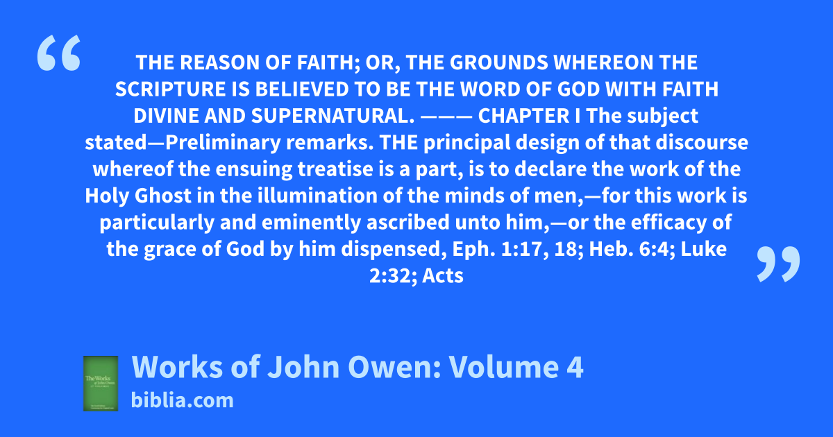 THE REASON OF FAITH; OR, THE GROUNDS WHEREON THE SCRIPTURE IS BELIEVED TO BE THE WORD OF GOD WITH FAITH DIVINE AND SUPERNATURAL. ——— CHAPTER I The subject stated—Preliminary remarks. THE principal design of that discourse whereof the ensuing treatise is a part, is to declare the work of the Holy Ghost in the illumination of the minds of men,—for this work is particularly and eminently ascribed unto him,—or the efficacy of the grace of God by him dispensed, Eph. 1:17, 18; Heb. 6:4; Luke 2:32; Acts