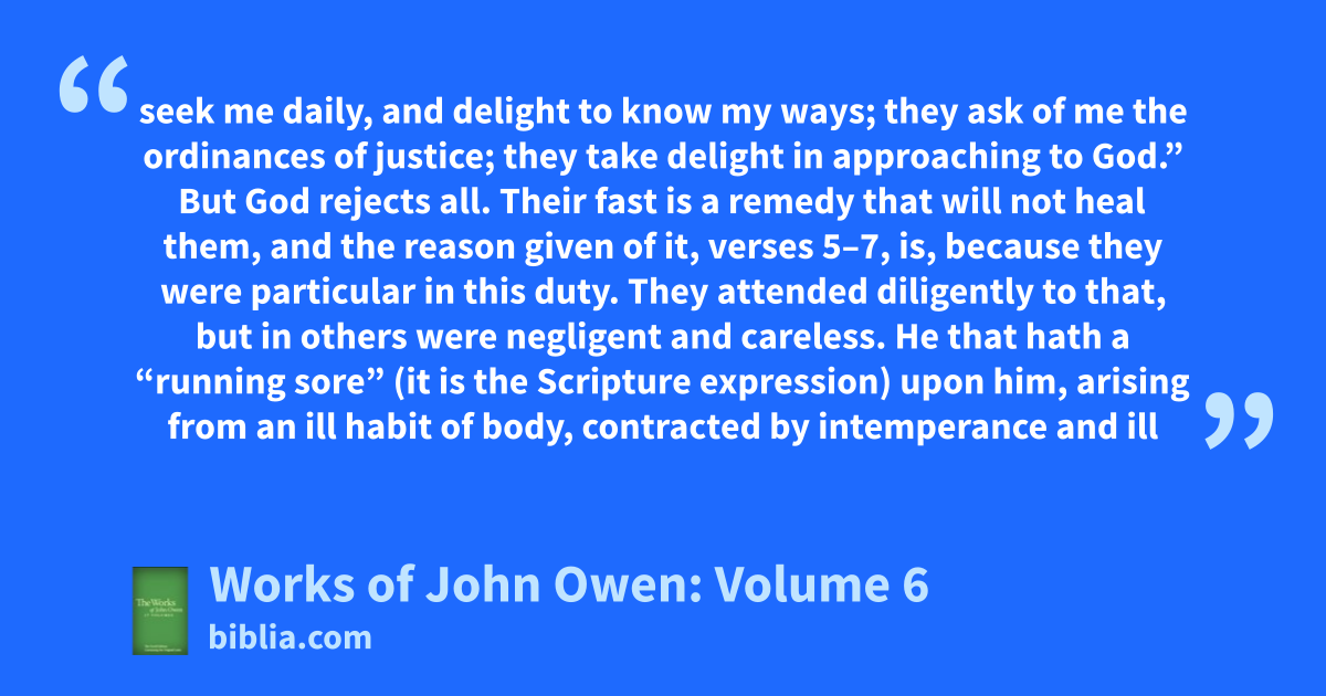 seek me daily, and delight to know my ways; they ask of me the ordinances of justice; they take delight in approaching to God.” But God rejects all. Their fast is a remedy that will not heal them, and the reason given of it, verses 5–7, is, because they were particular in this duty. They attended diligently to that, but in others were negligent and careless. He that hath a “running sore” (it is the Scripture expression) upon him, arising from an ill habit of body, contracted by intemperance and ill