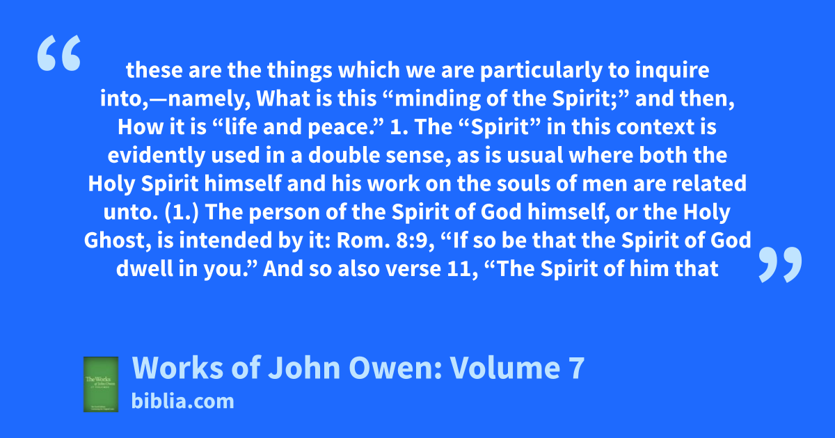 these are the things which we are particularly to inquire into,—namely, What is this “minding of the Spirit;” and then, How it is “life and peace.” 1. The “Spirit” in this context is evidently used in a double sense, as is usual where both the Holy Spirit himself and his work on the souls of men are related unto. (1.) The person of the Spirit of God himself, or the Holy Ghost, is intended by it: Rom. 8:9, “If so be that the Spirit of God dwell in you.” And so also verse 11, “The Spirit of him that