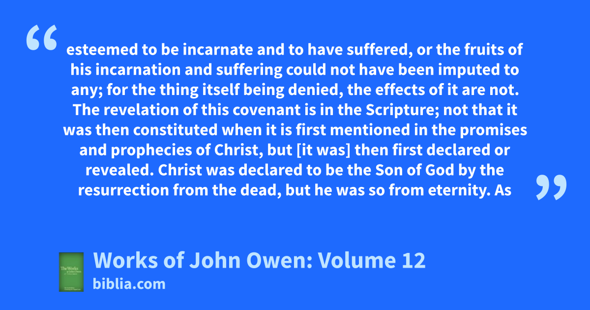 esteemed to be incarnate and to have suffered, or the fruits of his incarnation and suffering could not have been imputed to any; for the thing itself being denied, the effects of it are not. The revelation of this covenant is in the Scripture; not that it was then constituted when it is first mentioned in the promises and prophecies of Christ, but [it was] then first declared or revealed. Christ was declared to be the Son of God by the resurrection from the dead, but he was so from eternity. As