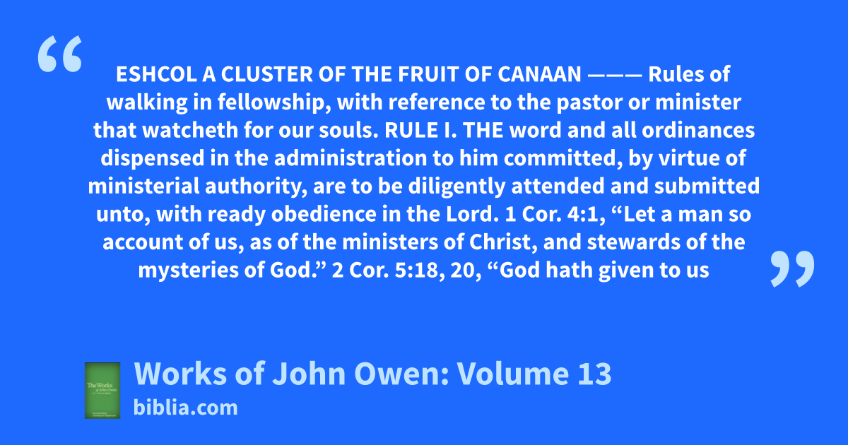 ESHCOL A CLUSTER OF THE FRUIT OF CANAAN ——— Rules of walking in fellowship, with reference to the pastor or minister that watcheth for our souls. RULE I. THE word and all ordinances dispensed in the administration to him committed, by virtue of ministerial authority, are to be diligently attended and submitted unto, with ready obedience in the Lord. 1 Cor. 4:1, “Let a man so account of us, as of the ministers of Christ, and stewards of the mysteries of God.” 2 Cor. 5:18, 20, “God hath given to us