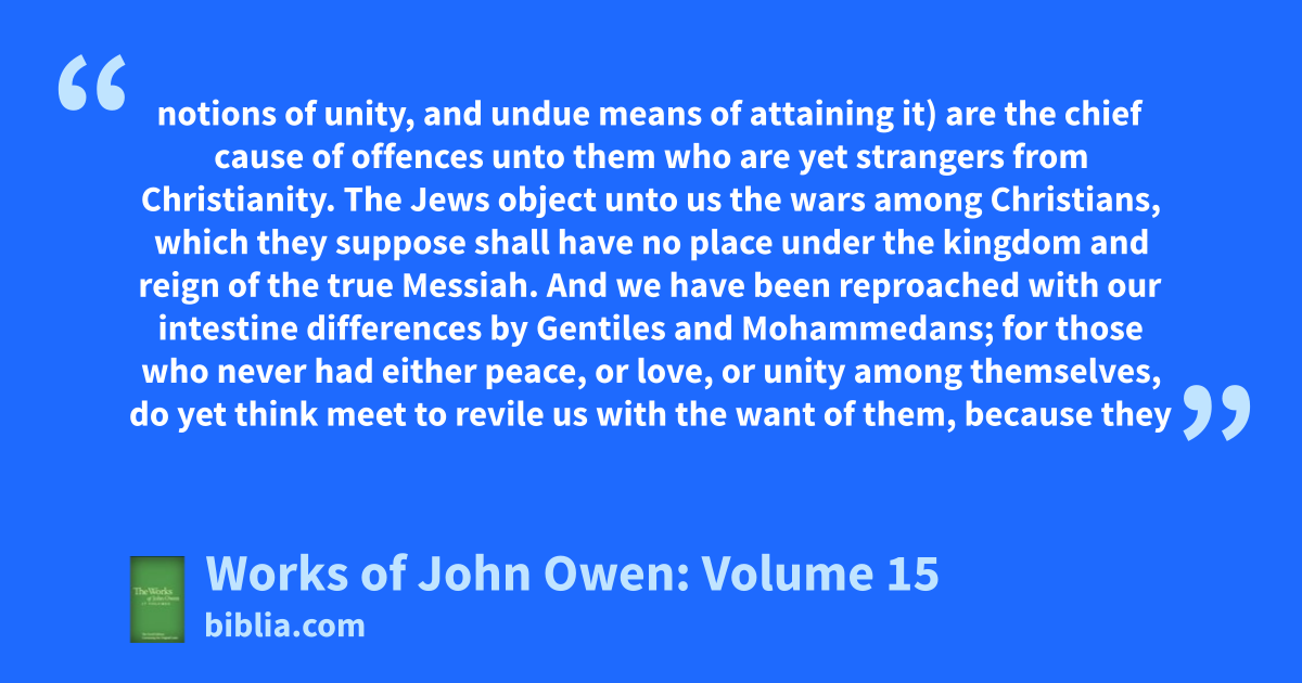 notions of unity, and undue means of attaining it) are the chief cause of offences unto them who are yet strangers from Christianity. The Jews object unto us the wars among Christians, which they suppose shall have no place under the kingdom and reign of the true Messiah. And we have been reproached with our intestine differences by Gentiles and Mohammedans; for those who never had either peace, or love, or unity among themselves, do yet think meet to revile us with the want of them, because they