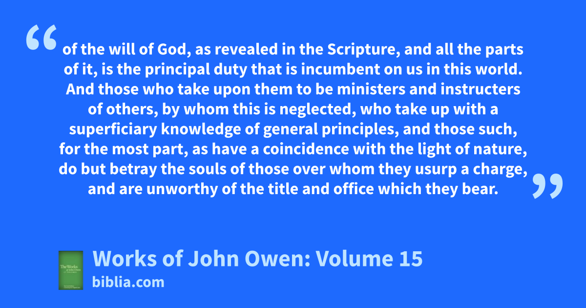 of the will of God, as revealed in the Scripture, and all the parts of it, is the principal duty that is incumbent on us in this world. And those who take upon them to be ministers and instructers of others, by whom this is neglected, who take up with a superficiary knowledge of general principles, and those such, for the most part, as have a coincidence with the light of nature, do but betray the souls of those over whom they usurp a charge, and are unworthy of the title and office which they bear.