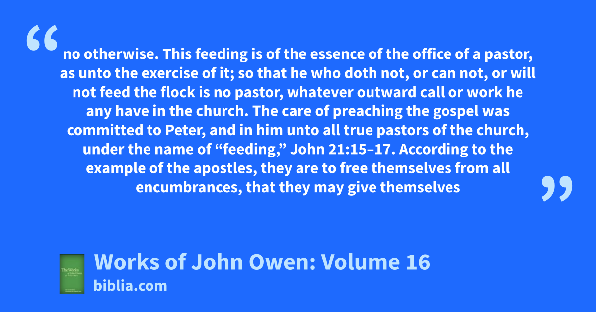 no otherwise. This feeding is of the essence of the office of a pastor, as unto the exercise of it; so that he who doth not, or can not, or will not feed the flock is no pastor, whatever outward call or work he any have in the church. The care of preaching the gospel was committed to Peter, and in him unto all true pastors of the church, under the name of “feeding,” John 21:15–17. According to the example of the apostles, they are to free themselves from all encumbrances, that they may give themselves