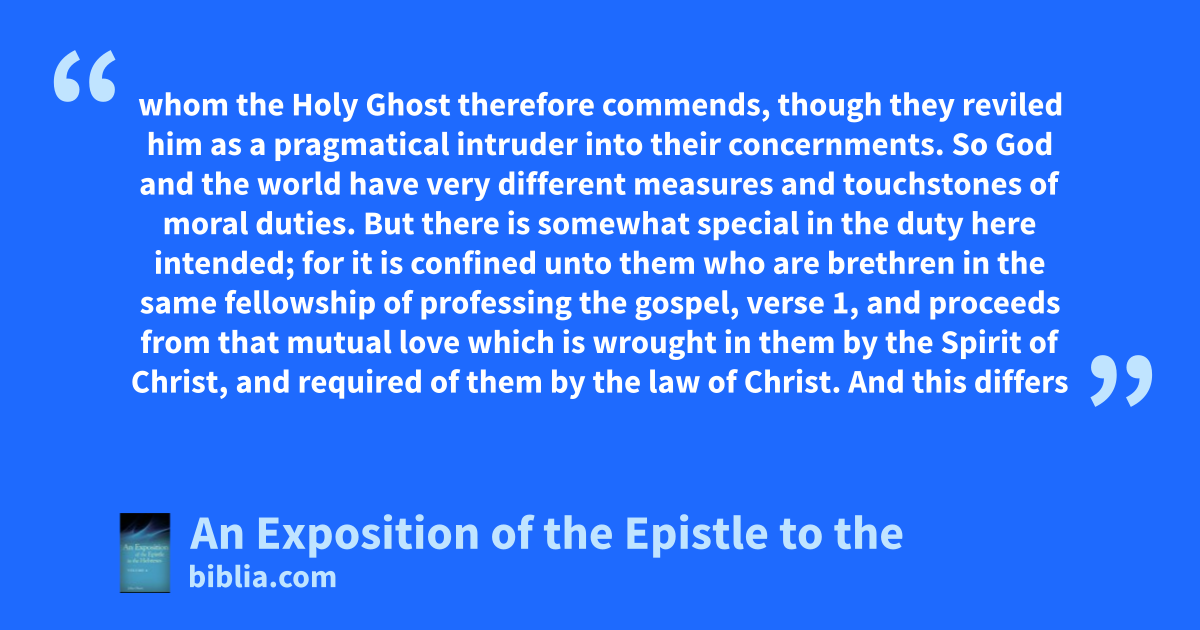 whom the Holy Ghost therefore commends, though they reviled him as a pragmatical intruder into their concernments. So God and the world have very different measures and touchstones of moral duties. But there is somewhat special in the duty here intended; for it is confined unto them who are brethren in the same fellowship of professing the gospel, verse 1, and proceeds from that mutual love which is wrought in them by the Spirit of Christ, and required of them by the law of Christ. And this differs