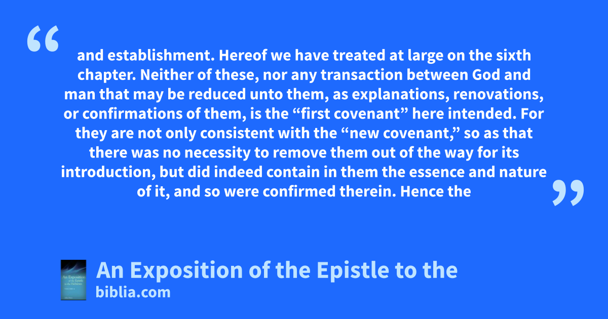 and establishment. Hereof we have treated at large on the sixth chapter. Neither of these, nor any transaction between God and man that may be reduced unto them, as explanations, renovations, or confirmations of them, is the “first covenant” here intended. For they are not only consistent with the “new covenant,” so as that there was no necessity to remove them out of the way for its introduction, but did indeed contain in them the essence and nature of it, and so were confirmed therein. Hence the