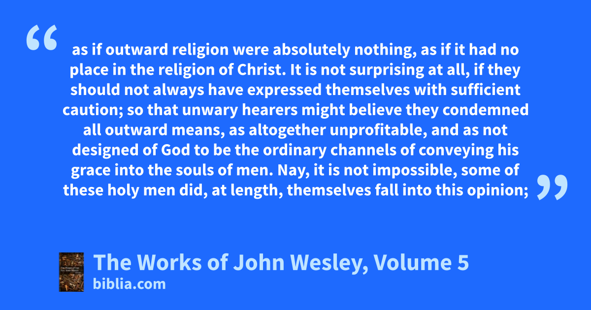 as if outward religion were absolutely nothing, as if it had no place in the religion of Christ. It is not surprising at all, if they should not always have expressed themselves with sufficient caution; so that unwary hearers might believe they condemned all outward means, as altogether unprofitable, and as not designed of God to be the ordinary channels of conveying his grace into the souls of men. Nay, it is not impossible, some of these holy men did, at length, themselves fall into this opinion;