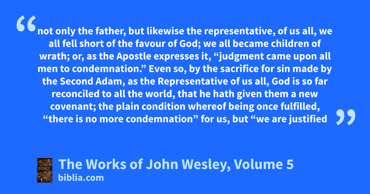 not only the father, but likewise the representative, of us all, we all fell short of the favour of God; we all became children of wrath; or, as the Apostle expresses it, “judgment came upon all men to condemnation.” Even so, by the sacrifice for sin made by the Second Adam, as the Representative of us all, God is so far reconciled to all the world, that he hath given them a new covenant; the plain condition whereof being once fulfilled, “there is no more condemnation” for us, but “we are justified