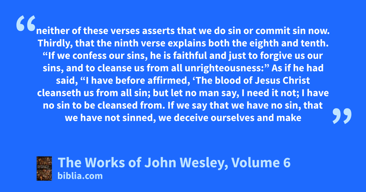 neither of these verses asserts that we do sin or commit sin now. Thirdly, that the ninth verse explains both the eighth and tenth. “If we confess our sins, he is faithful and just to forgive us our sins, and to cleanse us from all unrighteousness:” As if he had said, “I have before affirmed, ‘The blood of Jesus Christ cleanseth us from all sin; but let no man say, I need it not; I have no sin to be cleansed from. If we say that we have no sin, that we have not sinned, we deceive ourselves and make
