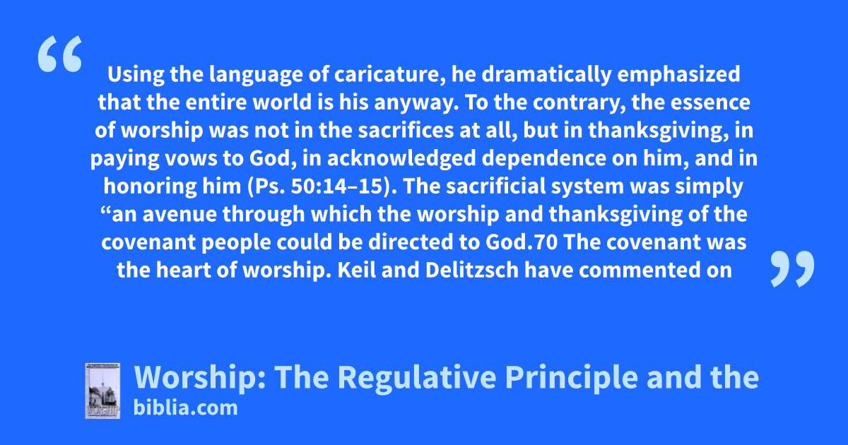 Using the language of caricature, he dramatically emphasized that the entire world is his anyway. To the contrary, the essence of worship was not in the sacrifices at all, but in thanksgiving, in paying vows to God, in acknowledged dependence on him, and in honoring him (Ps. 50:14–15). The sacrificial system was simply “an avenue through which the worship and thanksgiving of the covenant people could be directed to God.70 The covenant was the heart of worship. Keil and Delitzsch have commented on