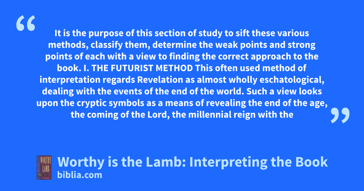It is the purpose of this section of study to sift these various methods, classify them, determine the weak points and strong points of each with a view to finding the correct approach to the book. I. THE FUTURIST METHOD This often used method of interpretation regards Revelation as almost wholly eschatological, dealing with the events of the end of the world. Such a view looks upon the cryptic symbols as a means of revealing the end of the age, the coming of the Lord, the millennial reign with the