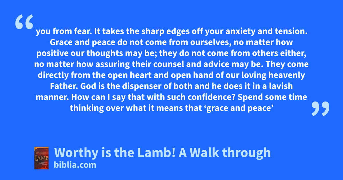 you from fear. It takes the sharp edges off your anxiety and tension. Grace and peace do not come from ourselves, no matter how positive our thoughts may be; they do not come from others either, no matter how assuring their counsel and advice may be. They come directly from the open heart and open hand of our loving heavenly Father. God is the dispenser of both and he does it in a lavish manner. How can I say that with such confidence? Spend some time thinking over what it means that ‘grace and peace’