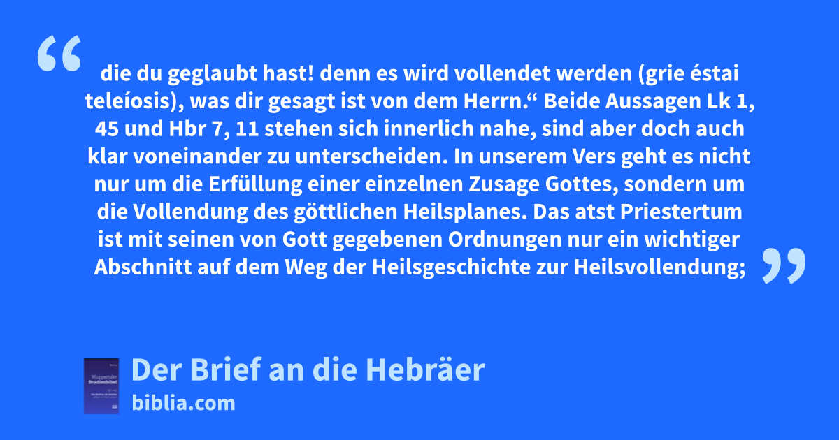 die du geglaubt hast! denn es wird vollendet werden (grie éstai teleíosis), was dir gesagt ist von dem Herrn.“ Beide Aussagen Lk 1, 45 und Hbr 7, 11 stehen sich innerlich nahe, sind aber doch auch klar voneinander zu unterscheiden. In unserem Vers geht es nicht nur um die Erfüllung einer einzelnen Zusage Gottes, sondern um die Vollendung des göttlichen Heilsplanes. Das atst Priestertum ist mit seinen von Gott gegebenen Ordnungen nur ein wichtiger Abschnitt auf dem Weg der Heilsgeschichte zur Heilsvollendung;