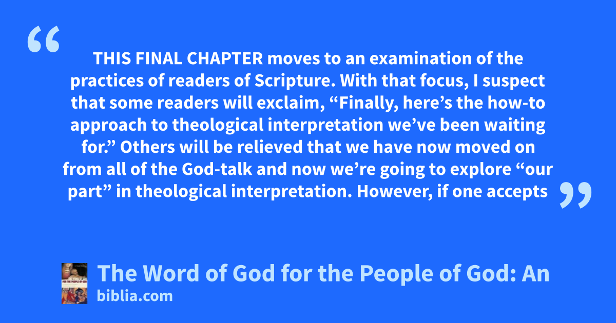 THIS FINAL CHAPTER moves to an examination of the practices of readers of Scripture. With that focus, I suspect that some readers will exclaim, “Finally, here’s the how-to approach to theological interpretation we’ve been waiting for.” Others will be relieved that we have now moved on from all of the God-talk and now we’re going to explore “our part” in theological interpretation. However, if one accepts