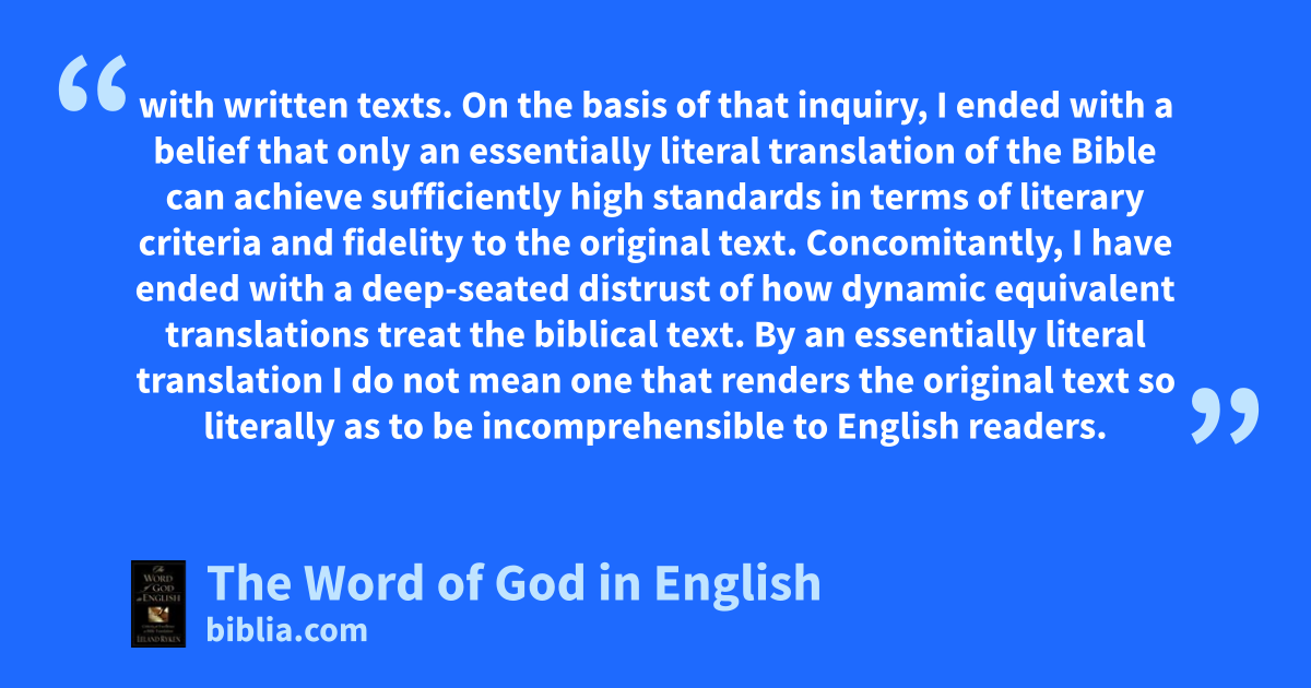 with written texts. On the basis of that inquiry, I ended with a belief that only an essentially literal translation of the Bible can achieve sufficiently high standards in terms of literary criteria and fidelity to the original text. Concomitantly, I have ended with a deep-seated distrust of how dynamic equivalent translations treat the biblical text. By an essentially literal translation I do not mean one that renders the original text so literally as to be incomprehensible to English readers.
