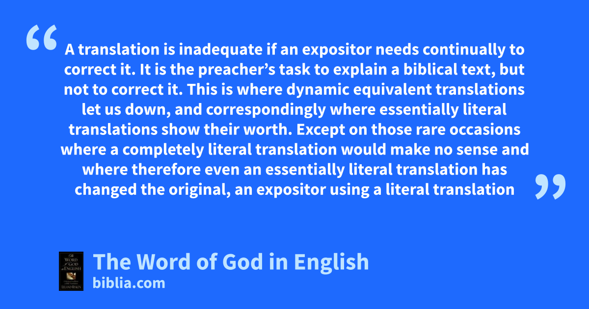 A translation is inadequate if an expositor needs continually to correct it. It is the preacher’s task to explain a biblical text, but not to correct it. This is where dynamic equivalent translations let us down, and correspondingly where essentially literal translations show their worth. Except on those rare occasions where a completely literal translation would make no sense and where therefore even an essentially literal translation has changed the original, an expositor using a literal translation