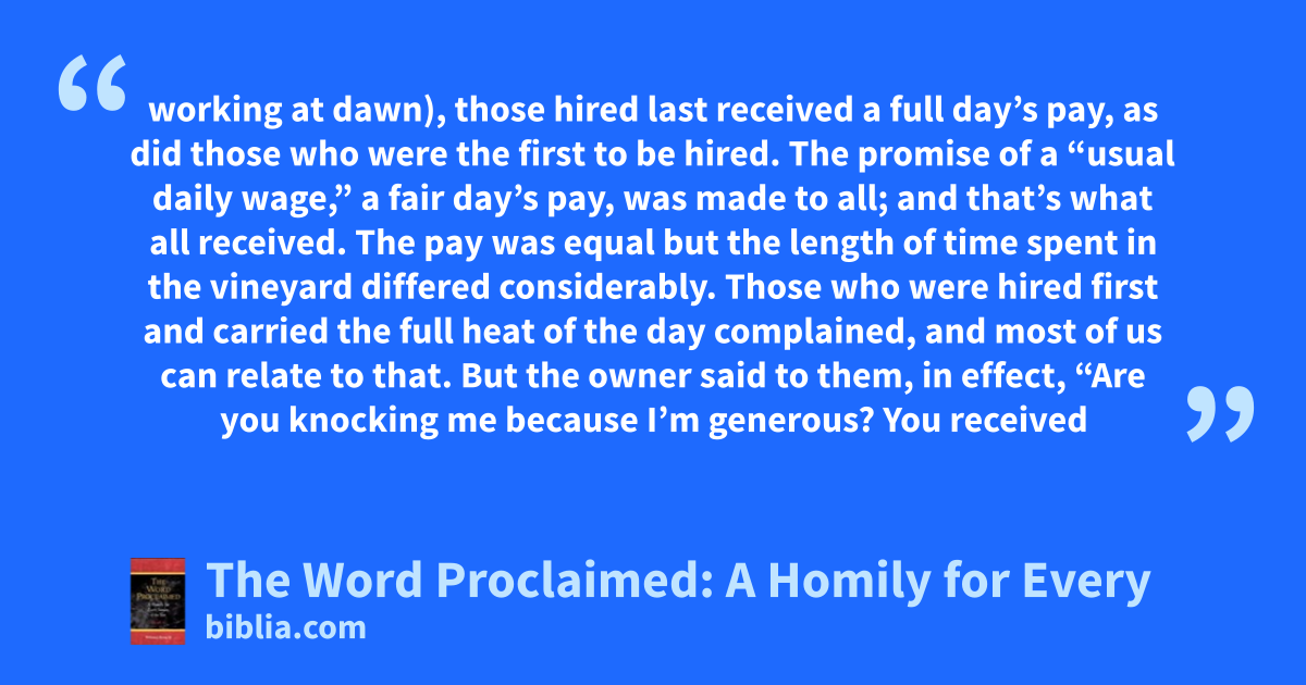 working at dawn), those hired last received a full day’s pay, as did those who were the first to be hired. The promise of a “usual daily wage,” a fair day’s pay, was made to all; and that’s what all received. The pay was equal but the length of time spent in the vineyard differed considerably. Those who were hired first and carried the full heat of the day complained, and most of us can relate to that. But the owner said to them, in effect, “Are you knocking me because I’m generous? You received