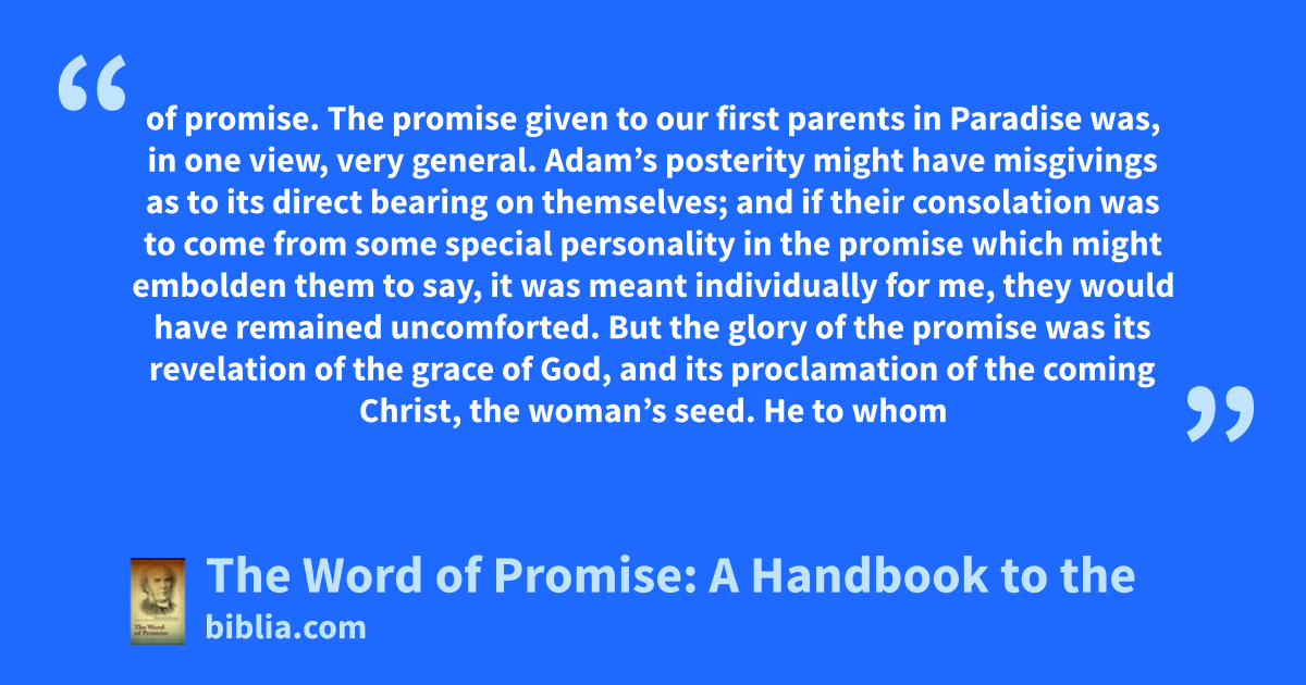 of promise. The promise given to our first parents in Paradise was, in one view, very general. Adam’s posterity might have misgivings as to its direct bearing on themselves; and if their consolation was to come from some special personality in the promise which might embolden them to say, it was meant individually for me, they would have remained uncomforted. But the glory of the promise was its revelation of the grace of God, and its proclamation of the coming Christ, the woman’s seed. He to whom