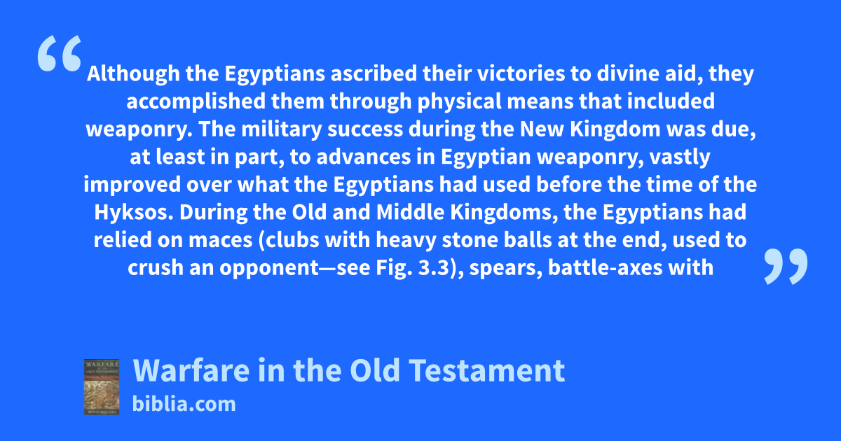 Although the Egyptians ascribed their victories to divine aid, they accomplished them through physical means that included weaponry. The military success during the New Kingdom was due, at least in part, to advances in Egyptian weaponry, vastly improved over what the Egyptians had used before the time of the Hyksos. During the Old and Middle Kingdoms, the Egyptians had relied on maces (clubs with heavy stone balls at the end, used to crush an opponent—see Fig. 3.3), spears, battle-axes with
