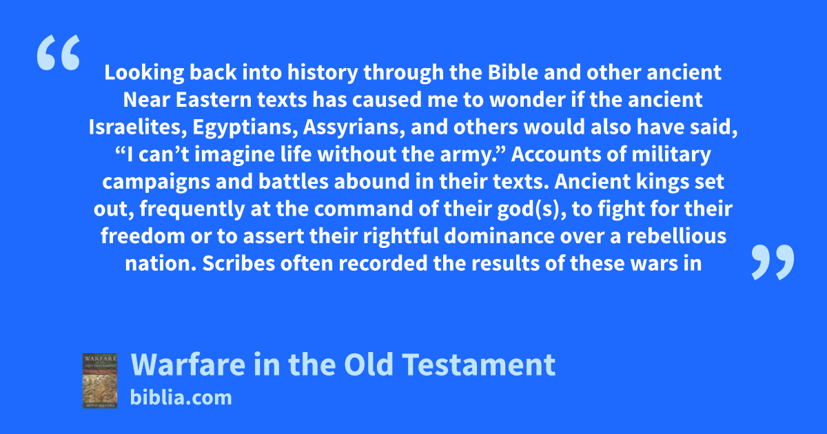 Looking back into history through the Bible and other ancient Near Eastern texts has caused me to wonder if the ancient Israelites, Egyptians, Assyrians, and others would also have said, “I can’t imagine life without the army.” Accounts of military campaigns and battles abound in their texts. Ancient kings set out, frequently at the command of their god(s), to fight for their freedom or to assert their rightful dominance over a rebellious nation. Scribes often recorded the results of these wars in