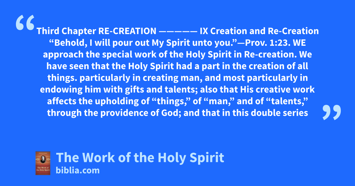 Third Chapter RE-CREATION ————— IX Creation and Re-Creation “Behold, I will pour out My Spirit unto you.”—Prov. 1:23. WE approach the special work of the Holy Spirit in Re-creation. We have seen that the Holy Spirit had a part in the creation of all things. particularly in creating man, and most particularly in endowing him with gifts and talents; also that His creative work affects the upholding of “things,” of “man,” and of “talents,” through the providence of God; and that in this double series