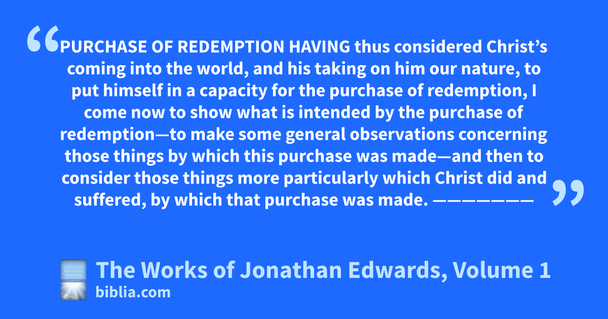 PURCHASE OF REDEMPTION HAVING thus considered Christ’s coming into the world, and his taking on him our nature, to put himself in a capacity for the purchase of redemption, I come now to show what is intended by the purchase of redemption—to make some general observations concerning those things by which this purchase was made—and then to consider those things more particularly which Christ did and suffered, by which that purchase was made. ———————