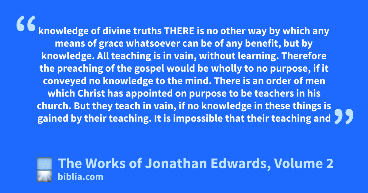 knowledge of divine truths THERE is no other way by which any means of grace whatsoever can be of any benefit, but by knowledge. All teaching is in vain, without learning. Therefore the preaching of the gospel would be wholly to no purpose, if it conveyed no knowledge to the mind. There is an order of men which Christ has appointed on purpose to be teachers in his church. But they teach in vain, if no knowledge in these things is gained by their teaching. It is impossible that their teaching and