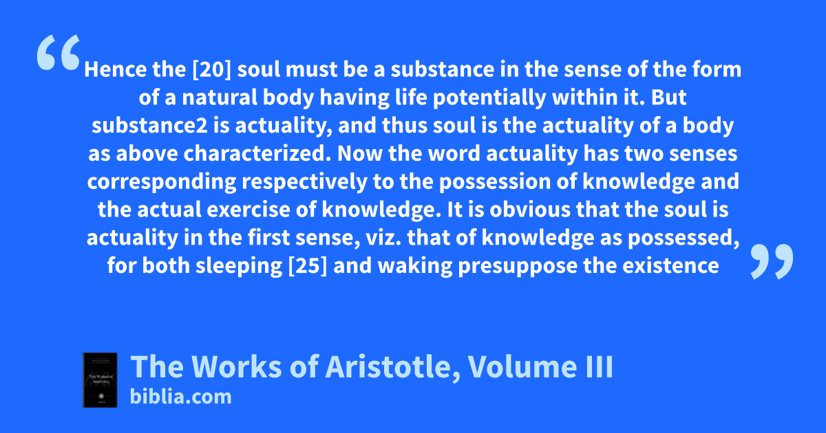 Hence the [20] soul must be a substance in the sense of the form of a natural body having life potentially within it. But substance2 is actuality, and thus soul is the actuality of a body as above characterized. Now the word actuality has two senses corresponding respectively to the possession of knowledge and the actual exercise of knowledge. It is obvious that the soul is actuality in the first sense, viz. that of knowledge as possessed, for both sleeping [25] and waking presuppose the existence