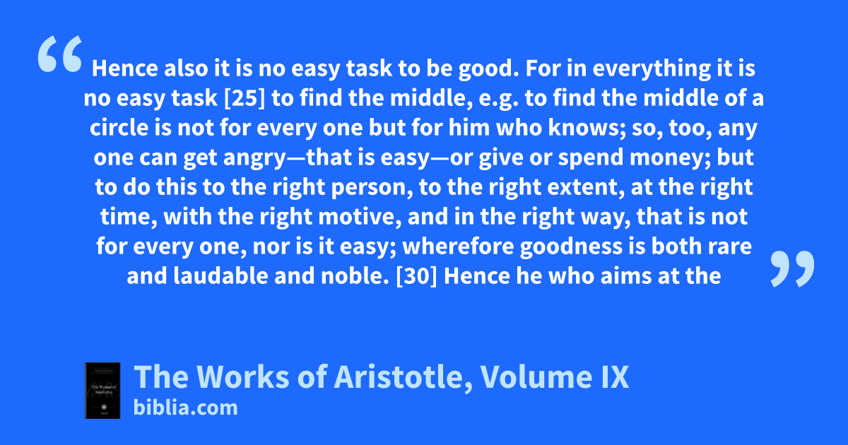 Hence also it is no easy task to be good. For in everything it is no easy task [25] to find the middle, e.g. to find the middle of a circle is not for every one but for him who knows; so, too, any one can get angry—that is easy—or give or spend money; but to do this to the right person, to the right extent, at the right time, with the right motive, and in the right way, that is not for every one, nor is it easy; wherefore goodness is both rare and laudable and noble. [30] Hence he who aims at the