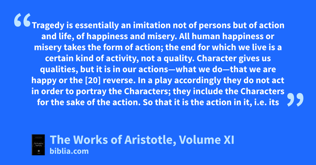 Tragedy is essentially an imitation not of persons but of action and life, of happiness and misery. All human happiness or misery takes the form of action; the end for which we live is a certain kind of activity, not a quality. Character gives us qualities, but it is in our actions—what we do—that we are happy or the [20] reverse. In a play accordingly they do not act in order to portray the Characters; they include the Characters for the sake of the action. So that it is the action in it, i.e. its
