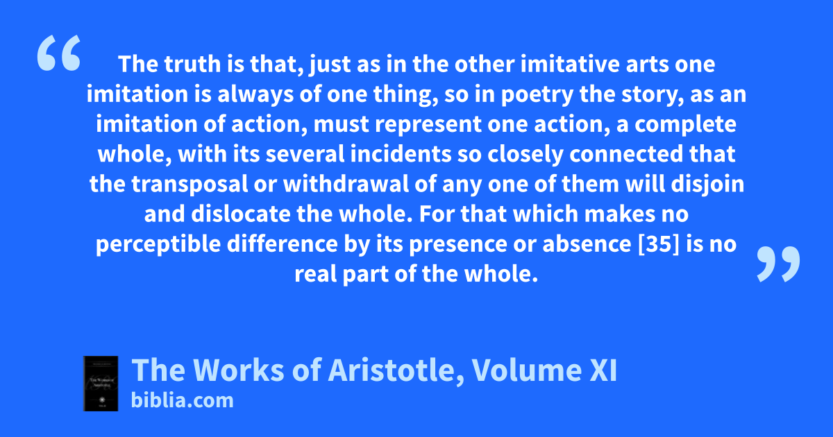 The truth is that, just as in the other imitative arts one imitation is always of one thing, so in poetry the story, as an imitation of action, must represent one action, a complete whole, with its several incidents so closely connected that the transposal or withdrawal of any one of them will disjoin and dislocate the whole. For that which makes no perceptible difference by its presence or absence [35] is no real part of the whole.