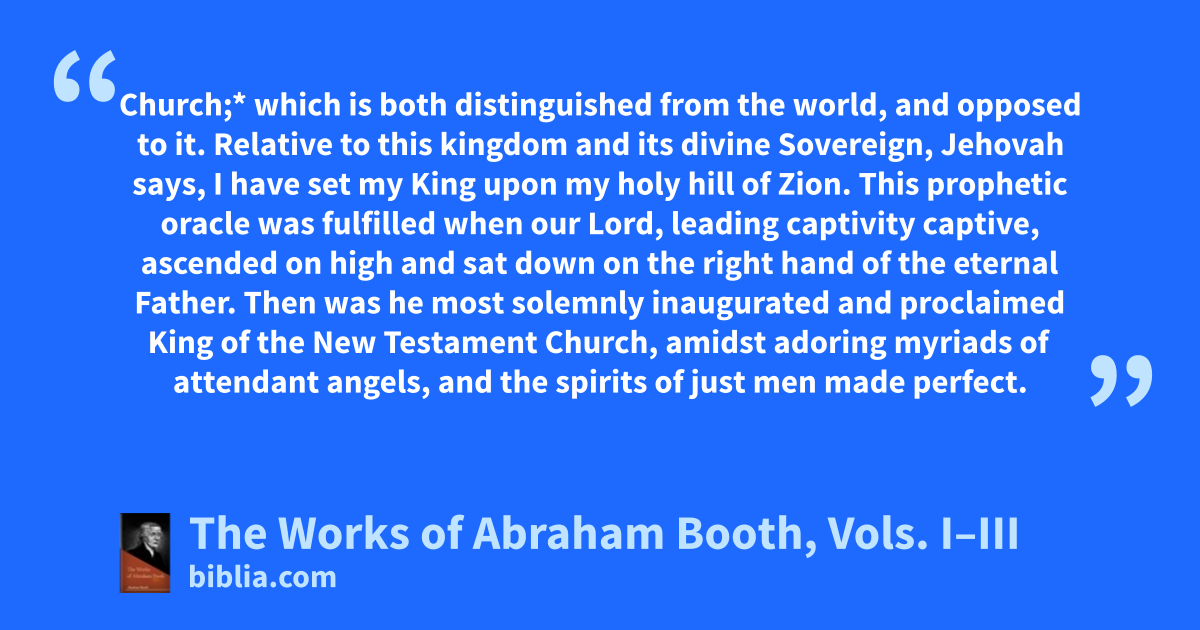 Church;* which is both distinguished from the world, and opposed to it. Relative to this kingdom and its divine Sovereign, Jehovah says, I have set my King upon my holy hill of Zion. This prophetic oracle was fulfilled when our Lord, leading captivity captive, ascended on high and sat down on the right hand of the eternal Father. Then was he most solemnly inaugurated and proclaimed King of the New Testament Church, amidst adoring myriads of attendant angels, and the spirits of just men made perfect.
