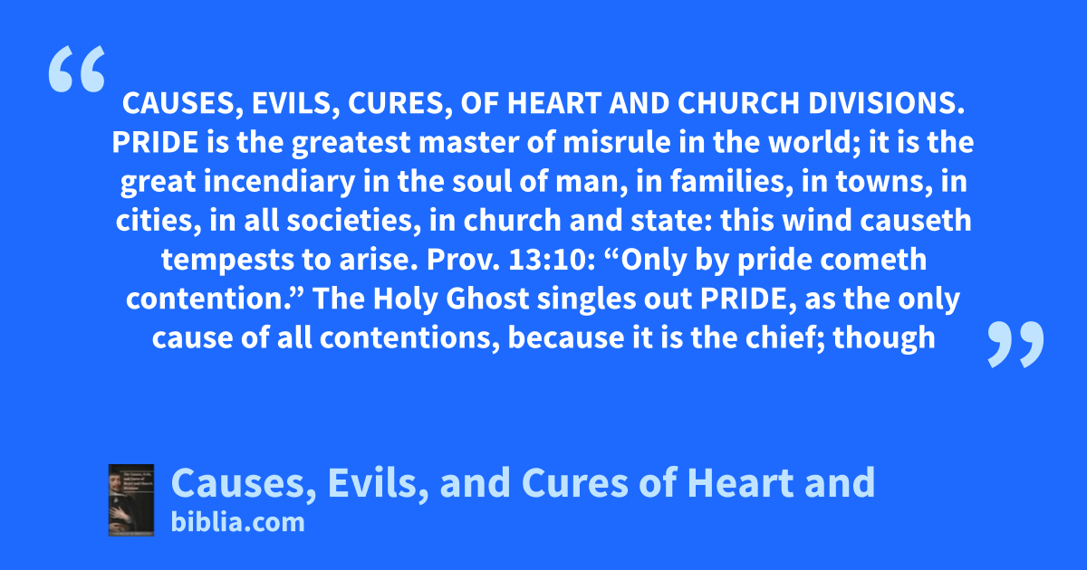 CAUSES, EVILS, CURES, OF HEART AND CHURCH DIVISIONS. PRIDE is the greatest master of misrule in the world; it is the great incendiary in the soul of man, in families, in towns, in cities, in all societies, in church and state: this wind causeth tempests to arise. Prov. 13:10: “Only by pride cometh contention.” The Holy Ghost singles out PRIDE, as the only cause of all contentions, because it is the chief; though