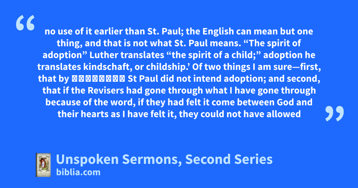 no use of it earlier than St. Paul; the English can mean but one thing, and that is not what St. Paul means. “The spirit of adoption” Luther translates “the spirit of a child;” adoption he translates kindschaft, or childship.’ Of two things I am sure—first, that by υἱοθεσία St Paul did not intend adoption; and second, that if the Revisers had gone through what I have gone through because of the word, if they had felt it come between God and their hearts as I have felt it, they could not have allowed