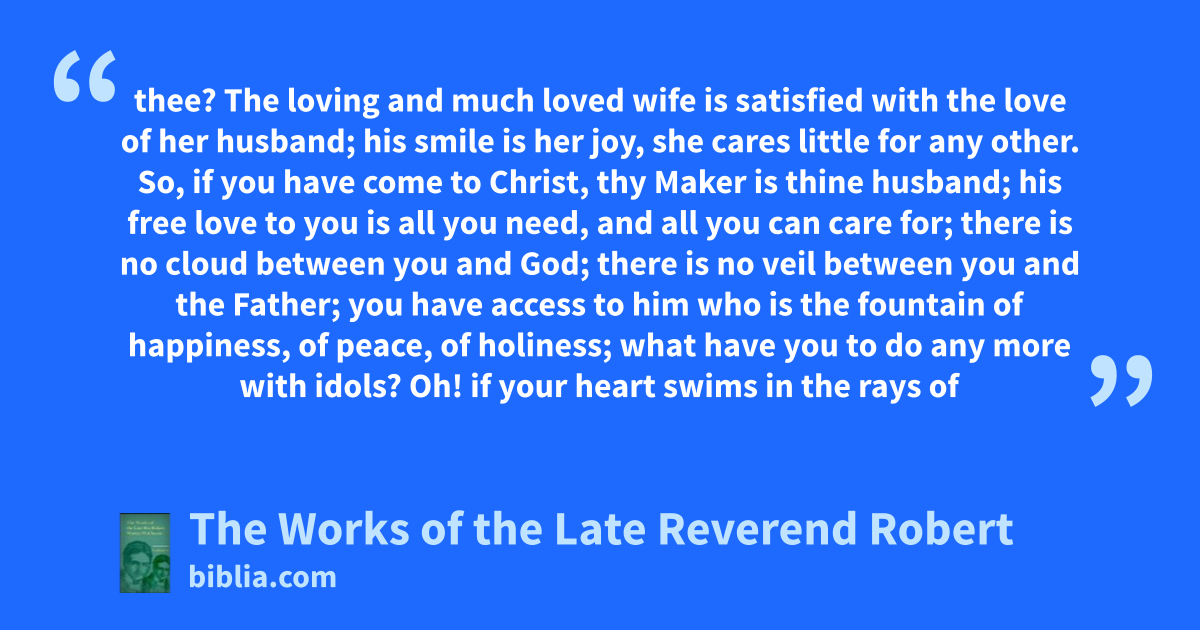 thee? The loving and much loved wife is satisfied with the love of her husband; his smile is her joy, she cares little for any other. So, if you have come to Christ, thy Maker is thine husband; his free love to you is all you need, and all you can care for; there is no cloud between you and God; there is no veil between you and the Father; you have access to him who is the fountain of happiness, of peace, of holiness; what have you to do any more with idols? Oh! if your heart swims in the rays of